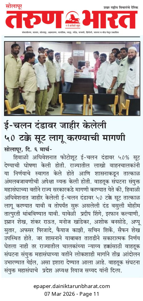 वाहतूक संघटना संयुक्त महासंघाच्या वतीने राज्य सरकारला मागणी करण्यात येते की, हिवाळी अधिवेशनात जाहीर केलेली ई-चलन दंडावर ५०% सूट तात्काळ लागू करावी आणि तोपर्यंत सुरू असलेली दंड वसुली मोहीम थांबवावी.
